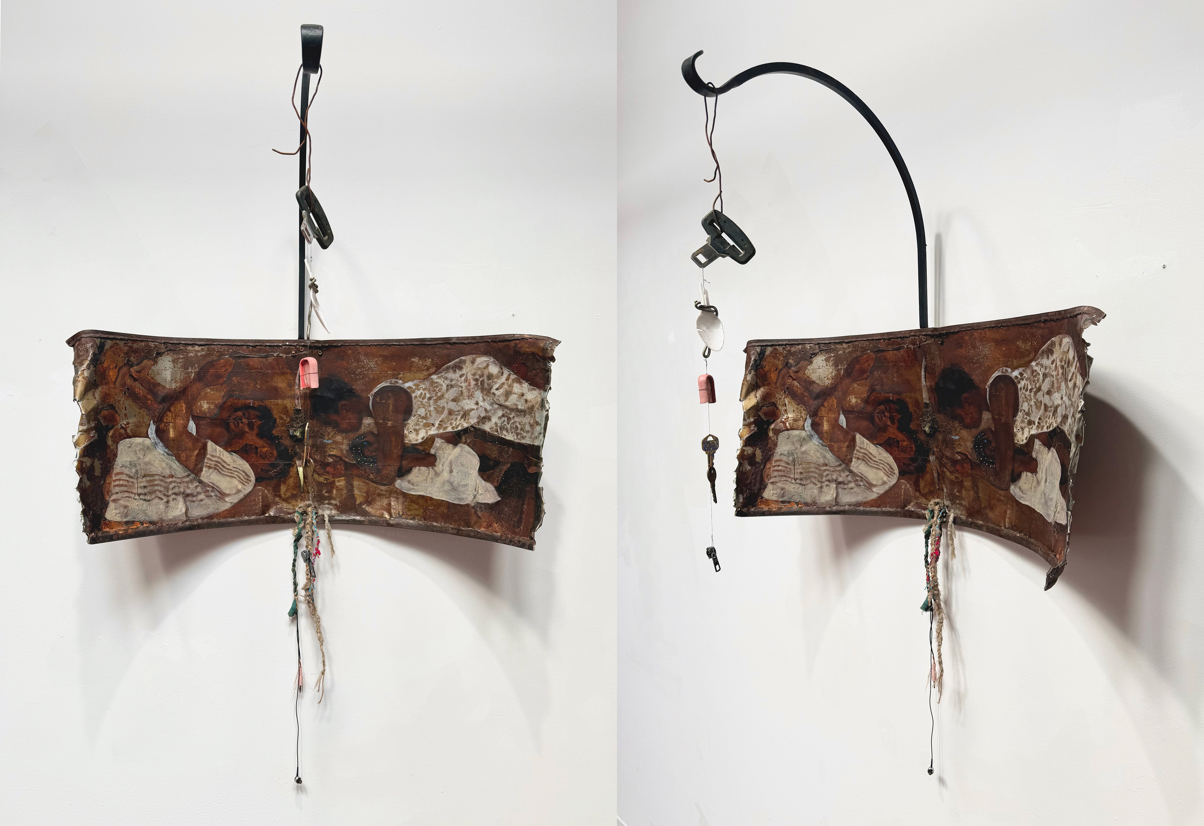 Acrylic and found materials (metal, plastic, fabric, car parts, wooden chair, rubber stamps, tile, and other miscellaneous objects)